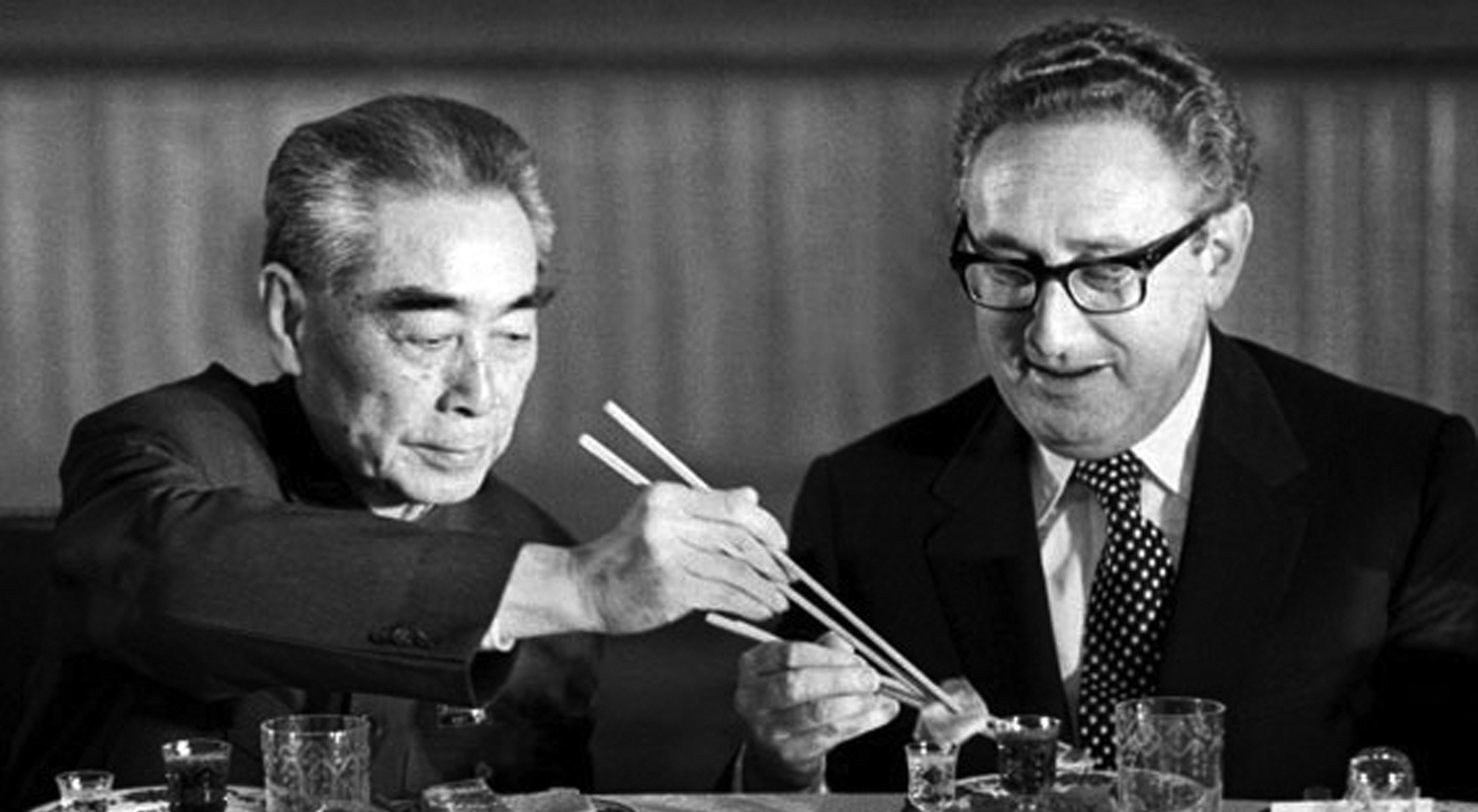 10 Nov 1973, Beijing, China — U.S. Secretary of State Henry Kissinger accepts food from Chinese Premier Zhou Enlai during a state banquet in the Great Hall of the People in Beijing. — Image by Bettmann/CORBIS
