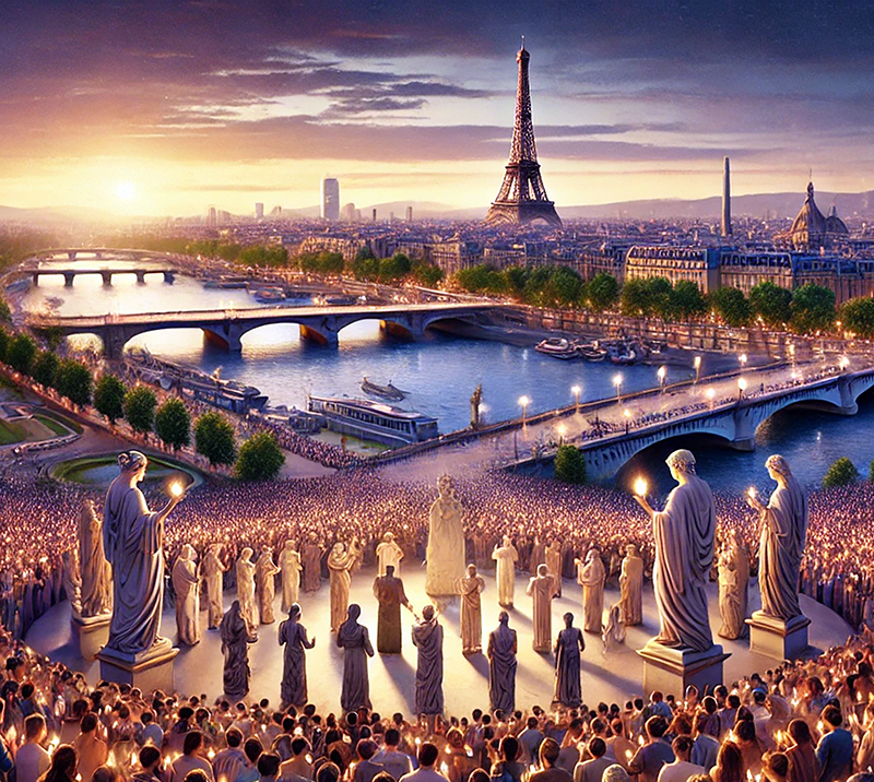 Opening ceremony of the Paris Olympics — teams gsthered for global peace (artist’s conception). | 巴黎奥运会开幕式——各国代表团齐聚一堂,共促全球和平(艺术家概念图)。