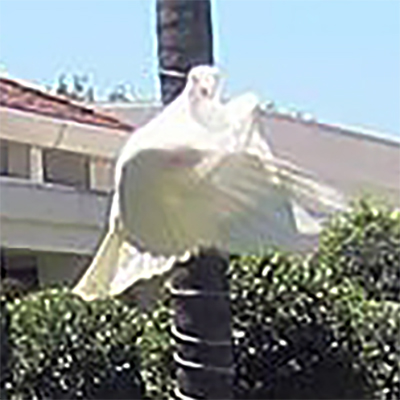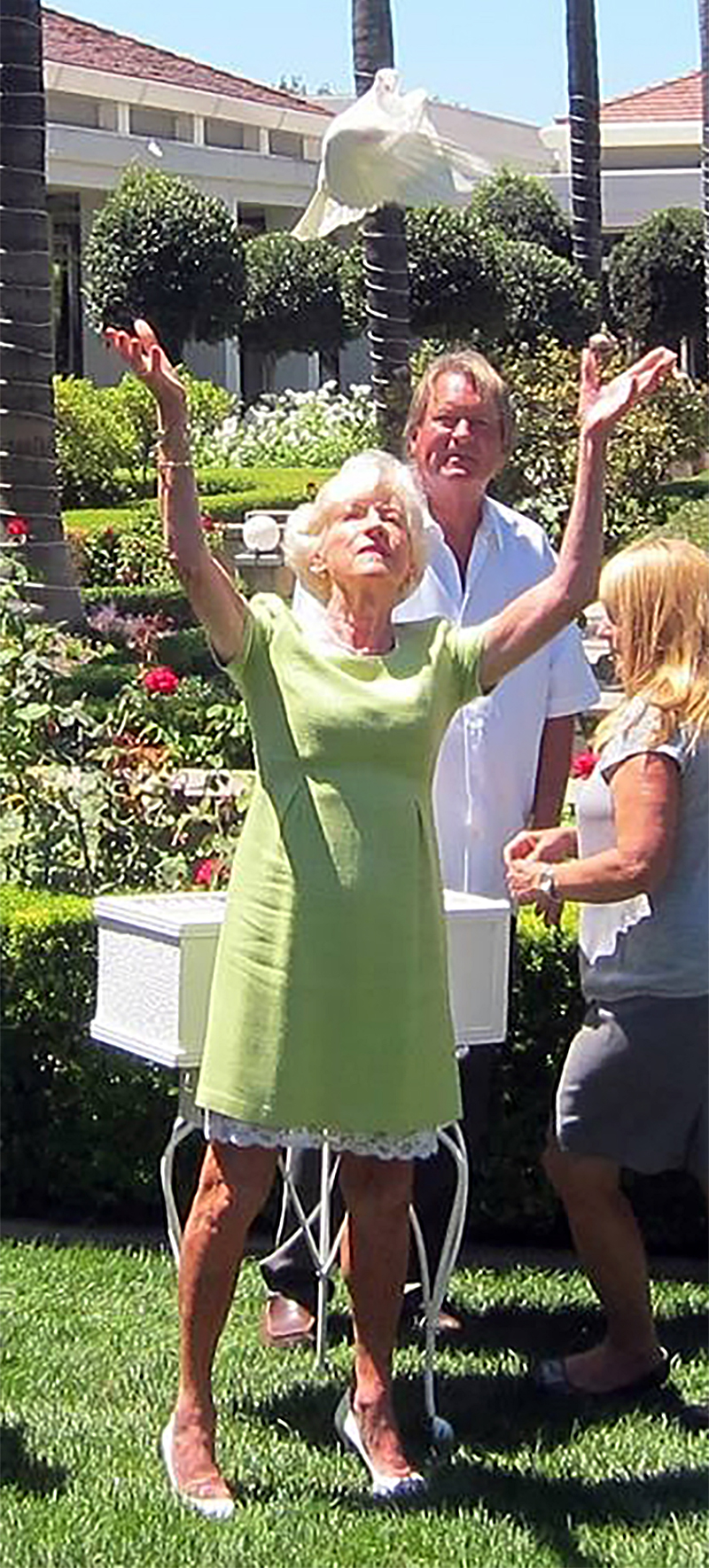 Mary, the grand-daughter of President Roosevelt, releases a dove of peace into the California sky above the Nixon Library. In honor of unity between China and America.